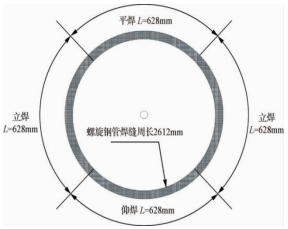 b.螺旋鋼管運至現(xiàn)場安裝焊接連接施工,焊接方法有平焊、立焊、仰焊,其中仰焊焊縫質(zhì)量控制難度大。